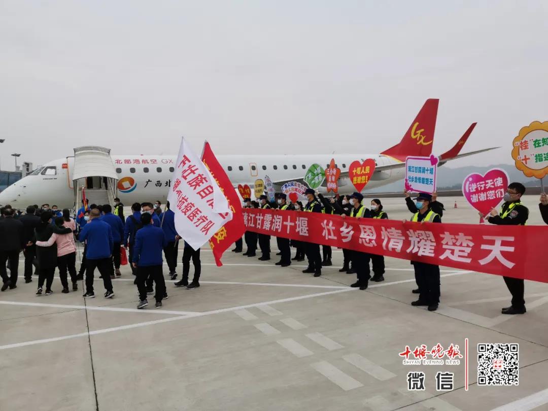 今天下午4时18分 ,一架飞往广西南宁的客机,从武当山机场腾空远去。机舱里,广西对口支援十堰的最后一批20名医疗队员,挥手与这