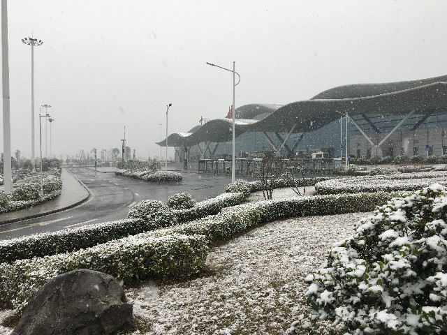 12月7日,十堰城区降下今冬首场雪。7日早,留在机场过夜的航班机身上落下一层积雪。7时30分,飞机起飞前,机场地服工作人员使用除冰车对机