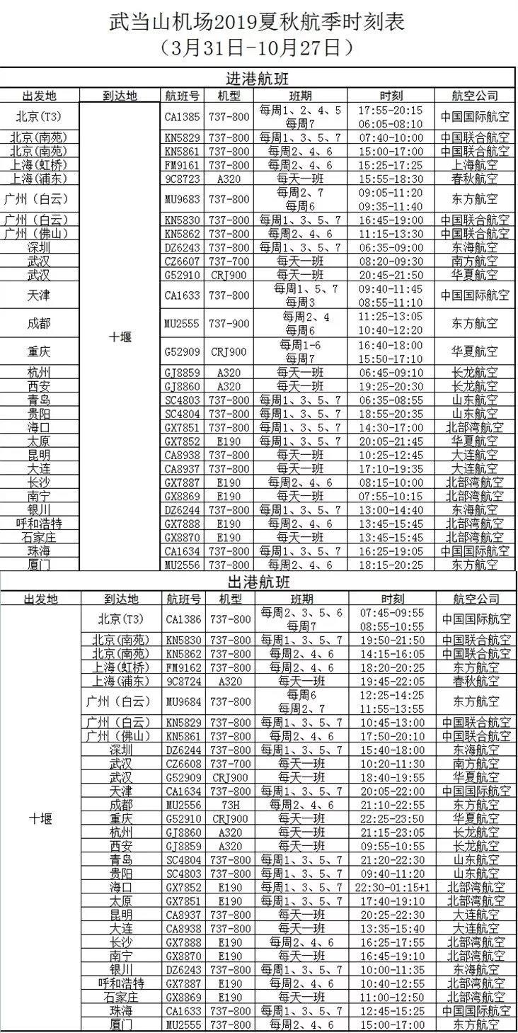 3月31日起,十堰武当山机场将执行2019夏秋航季时刻表。执行2019夏秋航季时刻表后,武当山机场将新增并加密上海(虹桥)、广州(白云)等航