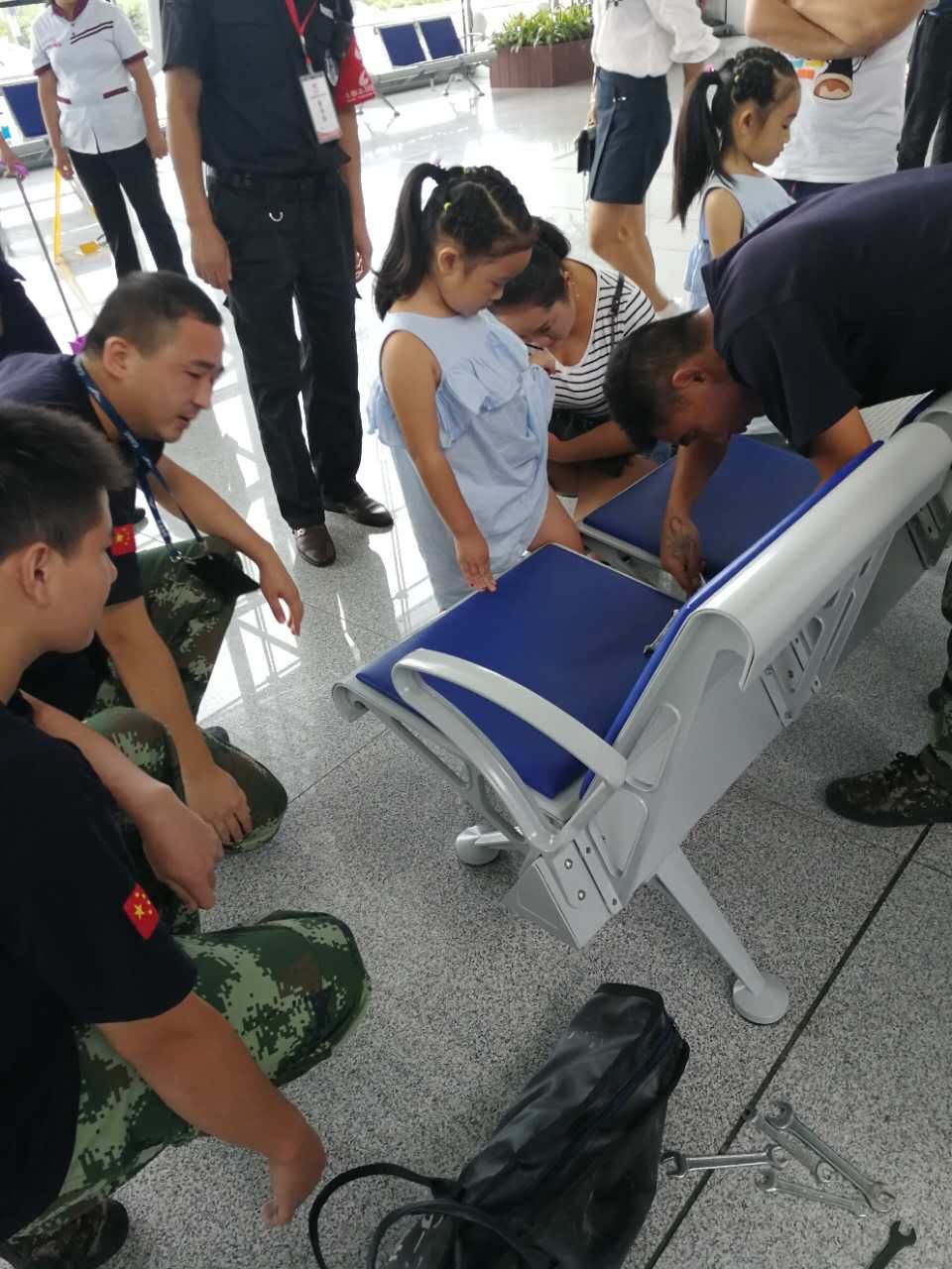 (现场救助顽童) 8月23日中午12时许,武当山机场一楼候机大厅里,一小女孩小腿被卡在座椅夹缝中,机场消防大队接到报警后,立即出动前