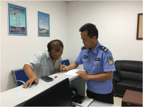 (民警耐心与该男子沟通) 8月15日16时许,机场值班民警在航站楼巡逻时,发现一名神色异常的男子。经了解,谈某(23岁,大冶人)系聋哑
