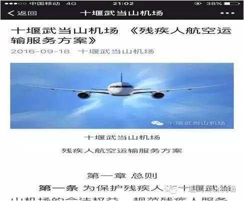 按照民航局《残疾人航空运输管理办法》和本场残疾人航空运输保障流程要求。10月19日晚,国航CA1811落地前5分钟,接现场指挥中心通知,国航从北京飞来的飞机上有一名全身瘫痪旅客,地面服务部迅速实施《十堰武当山机场残疾人航空运输服务方案》,第一时间保障残疾旅客,用实际行动践行“真情服务”,赢得了旅客和航空公司的一致好评。