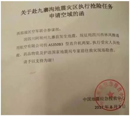 9日早上10:30,四川西林凤腾通航空域申请获批,西林凤腾通航的三架直升机,包括两架H125和一架EC135陆续从广汉基地起飞,经停绵阳,最后到达九寨沟受灾区,执行受灾人员抢救、药品物资等救灾任务。